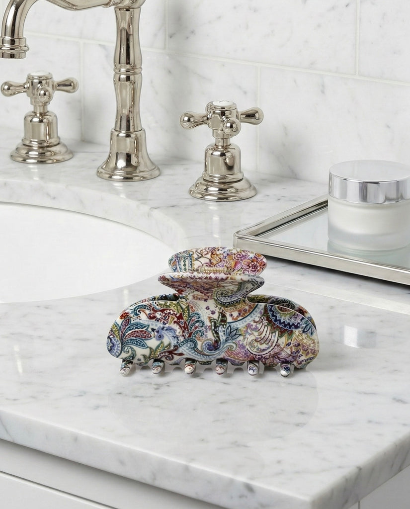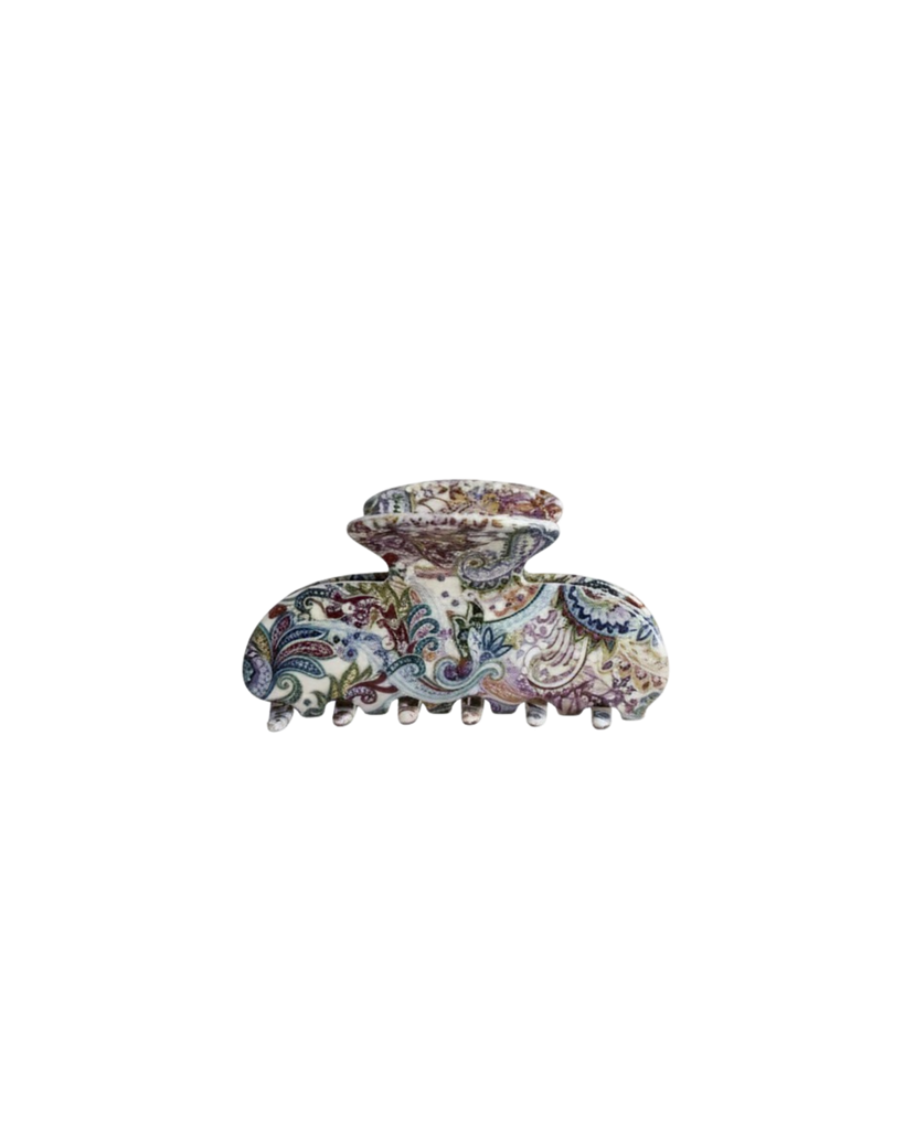 Our Amira Acetate Claw is a versatile and stylish accessory that effortlessly holds your hair in place while adding a touch of elegance. It features a mesmerizing multi chrome design with an elegant paisley pattern on each side, as well as on the inside. This intricate pattern creates a sophisticated and eye-catching visual effect, perfect for elevating any hairstyle. Adding a hint of sparkle and glamour, each side of the claw is adorned with handset crystals. These crystals catch the light and create a dazzling display, for that extra elegance in your hairstyle. The upper part of the claw is also beautifully decorated with crystals, making it a true statement piece. The claw also features a functional and extra strong spring and makes the accessory suitable for all hair types. Versatile and durable acetate are the perfect choice to style your everyday look or any special occasion.