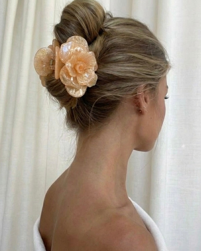 Die Elle Acetat-Haarspange in Champagner-Perle verleiht deiner Frisur feminine Eleganz und zeitlose Raffinesse. Handgefertigt aus einzeln übereinanderliegenden Acetatblütenblättern in Form einer zarten Rose, ist dieses Accessoire ein echter Blickfang – perfekt für Alltag, besondere Anlässe und festliche Events.