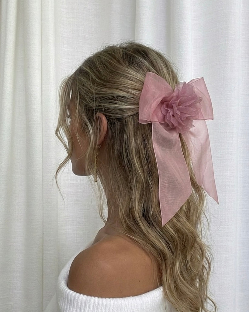 Die Rosie Organzaschleife in zartem Rosé verleiht deiner Frisur elegante Weiblichkeit und einen romantischen Akzent. Diese kürzere Version unserer beliebten Schleife wird handgefertigt mit höchster Sorgfalt, wodurch jede Haarschleife in Form und Größe einzigartig ist.
